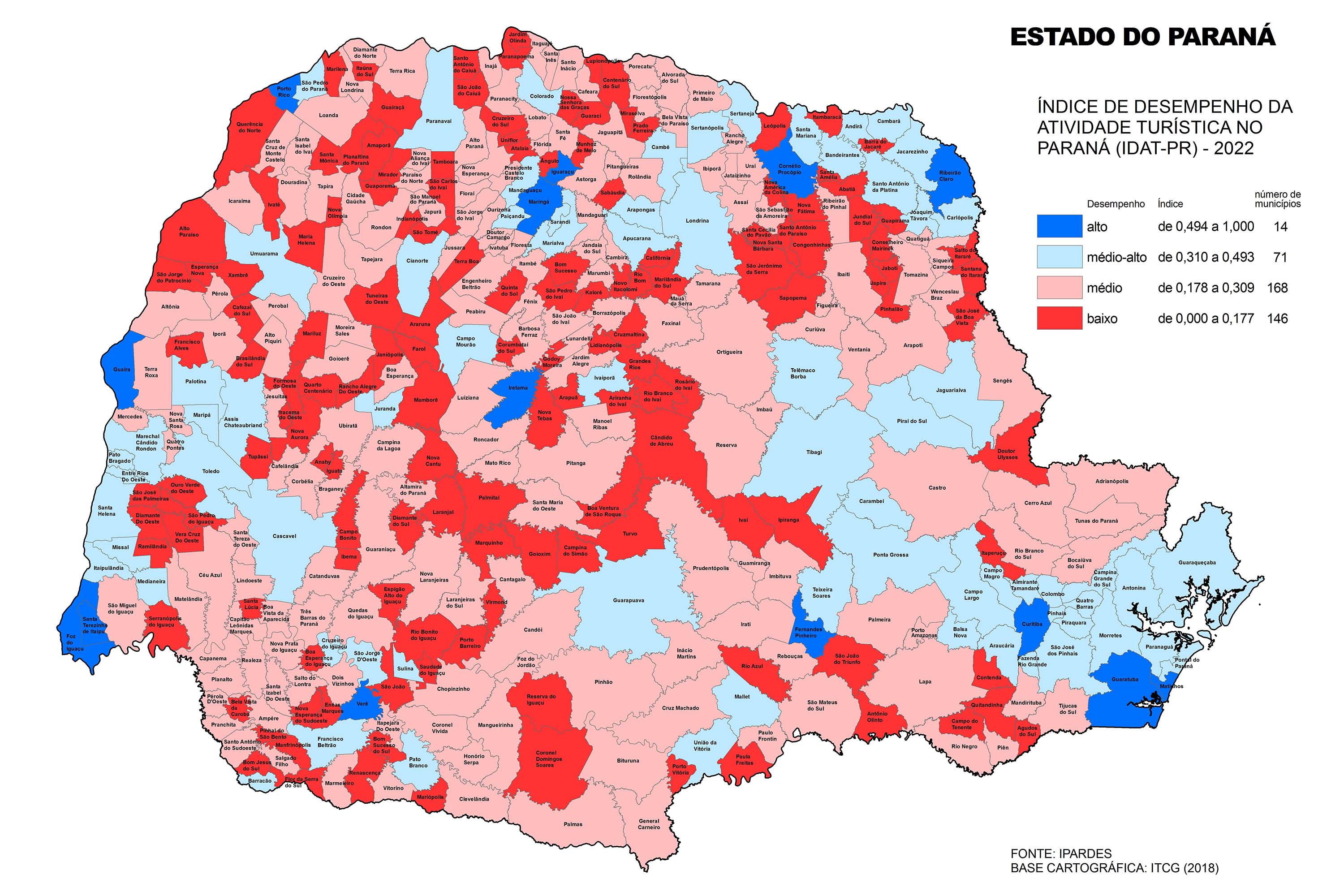Os resultados do IDAT-PR 2022 colocam 14 cidades com desempenho alto (de 0,494 a 1) e 71 com médio alto (0,310 a 0493). Aparecem em destaque os municípios de Foz do Iguaçu, Ribeirão Claro e Porto Rico, que assumiram as maiores pontuações entre os municípios paranaenses.